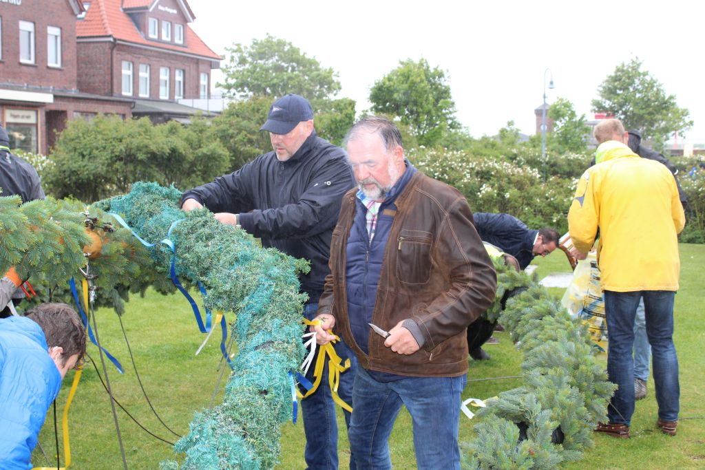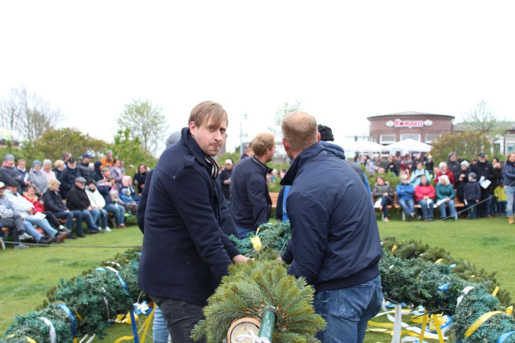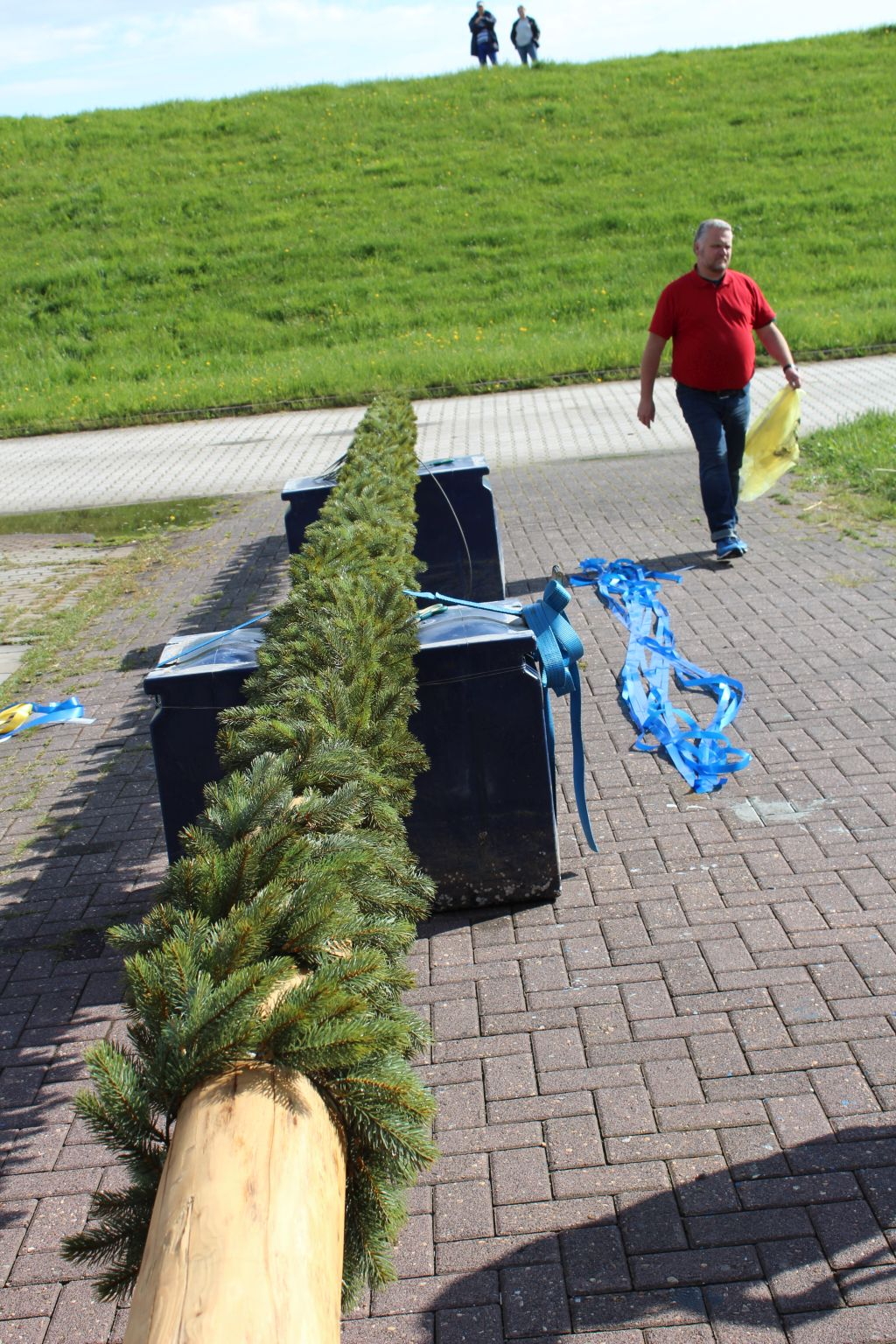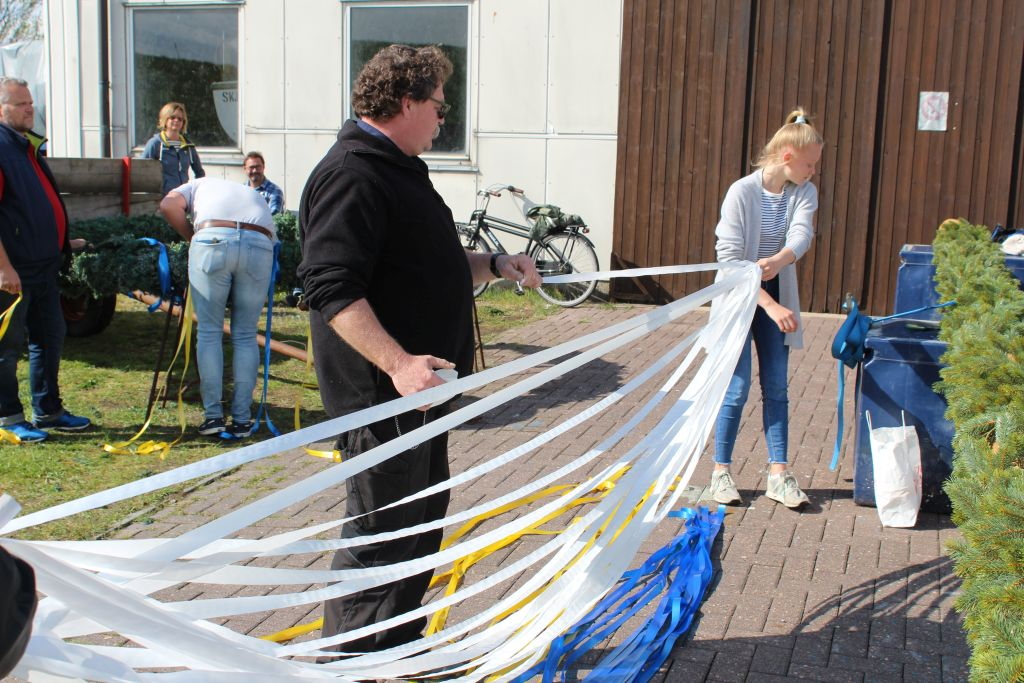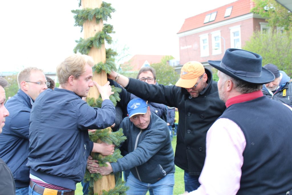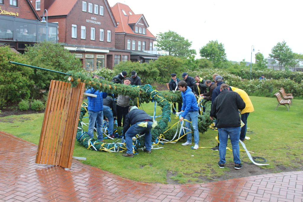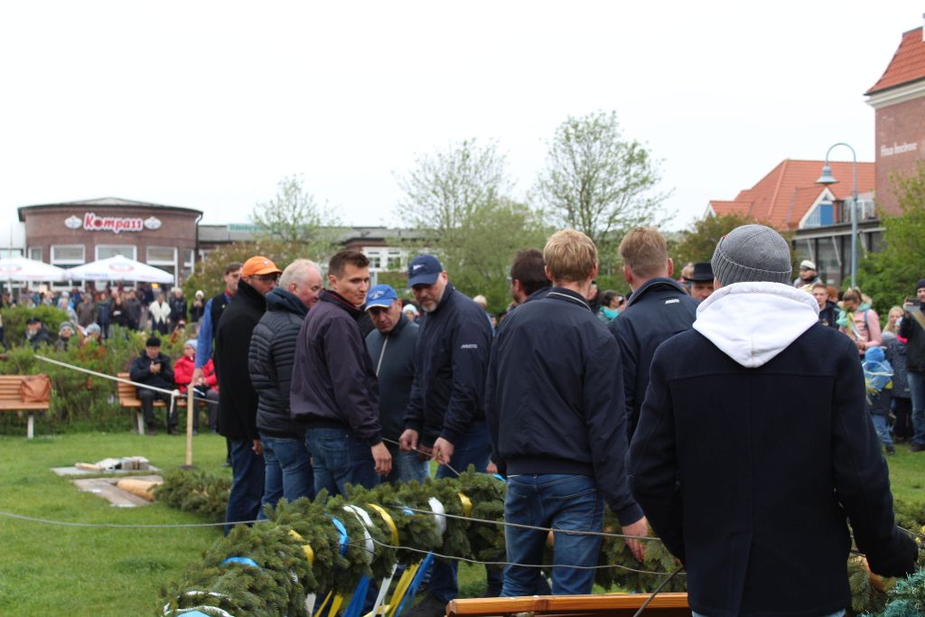 Zu den Aufgaben gehört die Vorbereitung und das Schmücken des Baumes, das Aufstellen, die Bewachung in der Nacht vom 30. April bis zum 1. Mai und das Abbauen am Monatsende. SKJ-Vorsitzender Olaf Weers freute sich, dass die Beteiligung der Mitglieder überall sehr stark und mehr als ausreichend war. Schon zum Schmücken am Bootshaus kamen bei strahlendem Sommerwetter sehr viele Wassersportler, Ehefrauen, Jugendliche und Kinder. Der Aufstellung voran ging ein Umzug durch das Dort, hier nahmen alleine 62 SKJ-Mitglieder teil, ebenso zahlreiche Insulaner, der Kindergarten „Schwalbennest“, die Volkstanz- und Trachtengruppe „Juister Hupfdohlen“ vom Heimatverein, vorneweg Thomas Fisser vom Shanty-Chor (aber auch SKJ-Mitglied) mit seinem Akkordeon. Es waren aber noch mehr Mitglieder aktiv, diese waren schon auf dem Kurplatz am Grill- oder Bierstand sowie als Musiker in der Konzertmuschel. Dort war nämlich der Musikzug der Freiwilligen Feuerwehr Juist unter der Leitung von Stabführer Michael Bockelmann (ebenfalls SKJ-Mitglied) mit bekannten Mailiedern dabei. Beim Aufstellen des Baumes gab es einige Helfer vom Heimatverein, die in jedem Jahr dabei sind und genau wissen, wie man den Baum aufstellt und gegen Umfallen sichert.