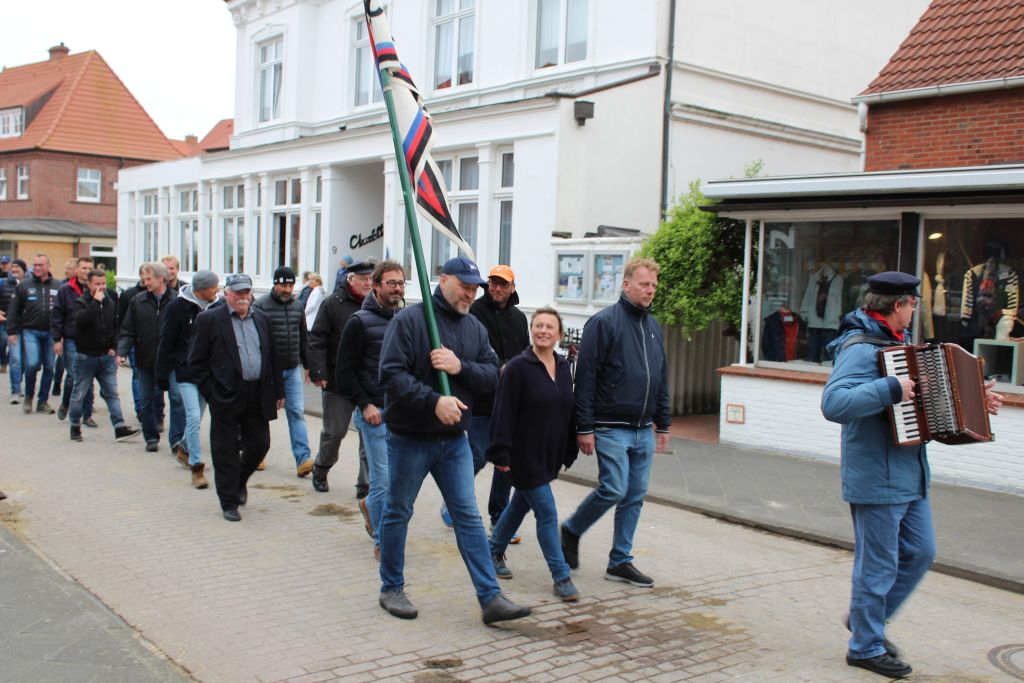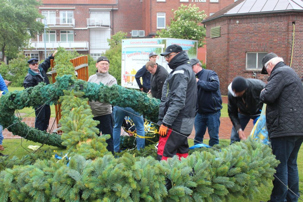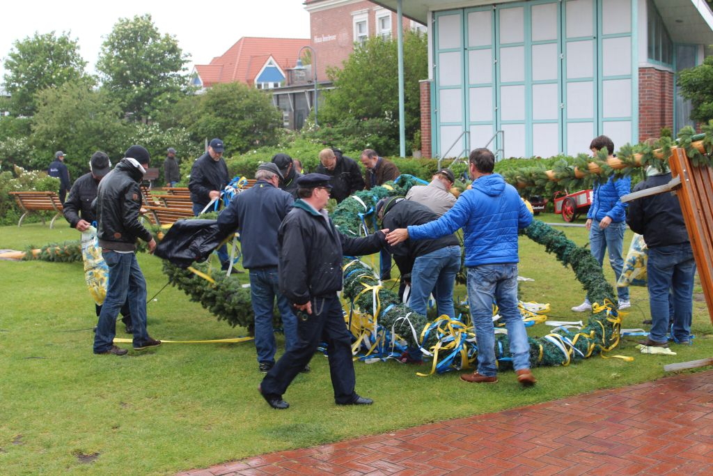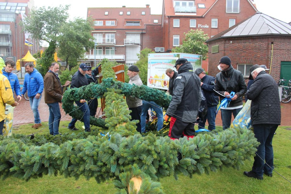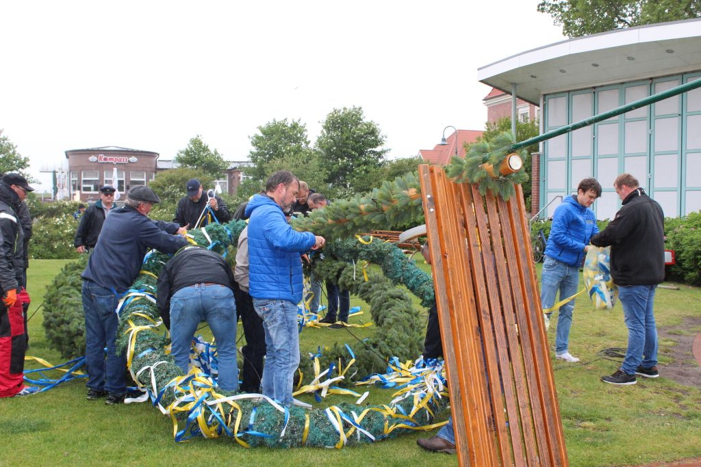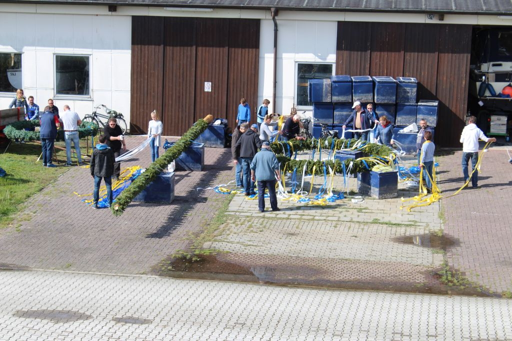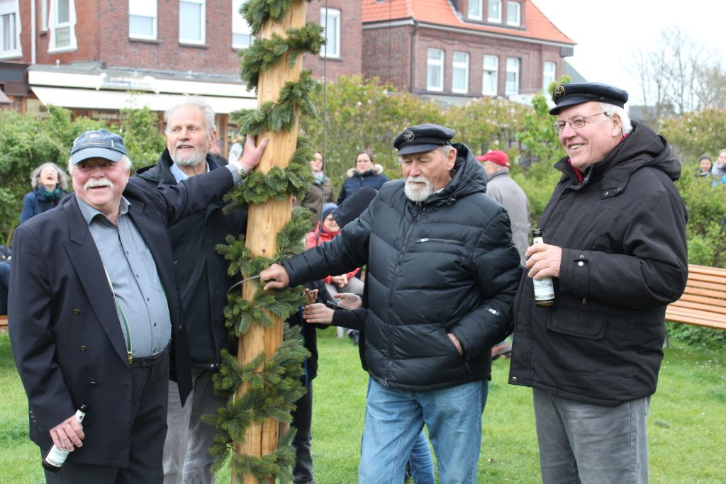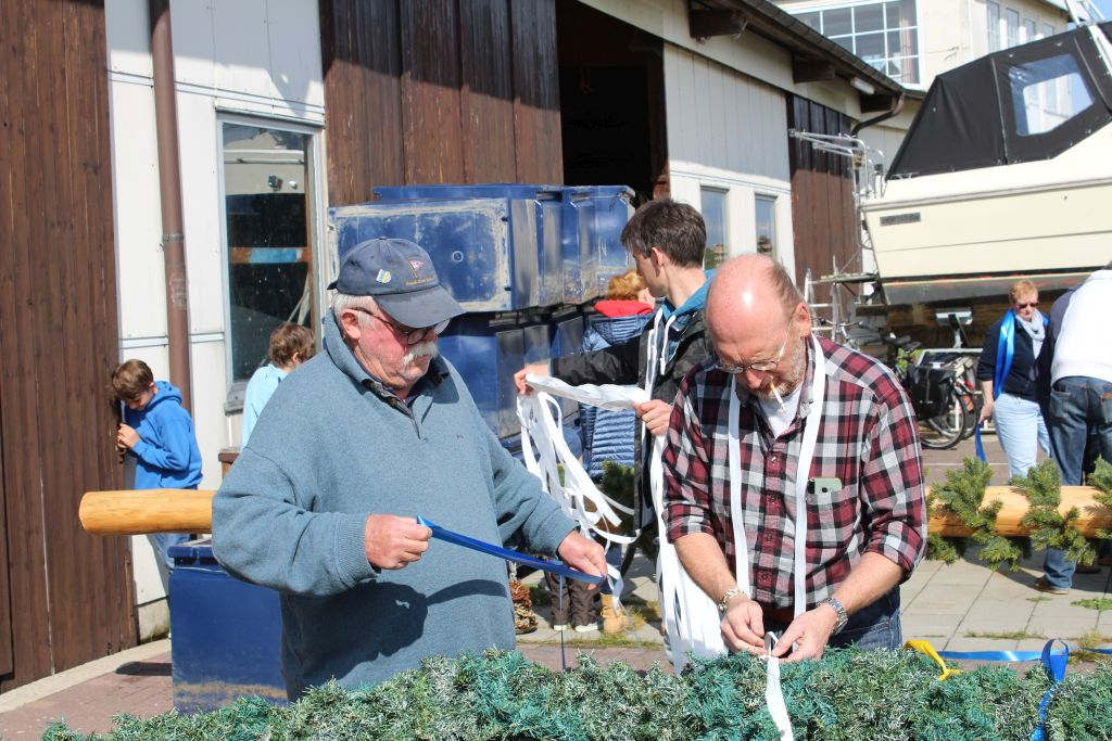 Zu den Aufgaben gehört die Vorbereitung und das Schmücken des Baumes, das Aufstellen, die Bewachung in der Nacht vom 30. April bis zum 1. Mai und das Abbauen am Monatsende. SKJ-Vorsitzender Olaf Weers freute sich, dass die Beteiligung der Mitglieder überall sehr stark und mehr als ausreichend war. Schon zum Schmücken am Bootshaus kamen bei strahlendem Sommerwetter sehr viele Wassersportler, Ehefrauen, Jugendliche und Kinder. Der Aufstellung voran ging ein Umzug durch das Dort, hier nahmen alleine 62 SKJ-Mitglieder teil, ebenso zahlreiche Insulaner, der Kindergarten „Schwalbennest“, die Volkstanz- und Trachtengruppe „Juister Hupfdohlen“ vom Heimatverein, vorneweg Thomas Fisser vom Shanty-Chor (aber auch SKJ-Mitglied) mit seinem Akkordeon. Es waren aber noch mehr Mitglieder aktiv, diese waren schon auf dem Kurplatz am Grill- oder Bierstand sowie als Musiker in der Konzertmuschel. Dort war nämlich der Musikzug der Freiwilligen Feuerwehr Juist unter der Leitung von Stabführer Michael Bockelmann (ebenfalls SKJ-Mitglied) mit bekannten Mailiedern dabei. Beim Aufstellen des Baumes gab es einige Helfer vom Heimatverein, die in jedem Jahr dabei sind und genau wissen, wie man den Baum aufstellt und gegen Umfallen sichert.