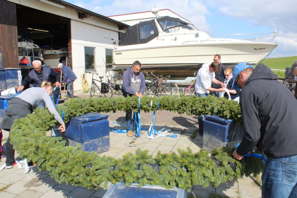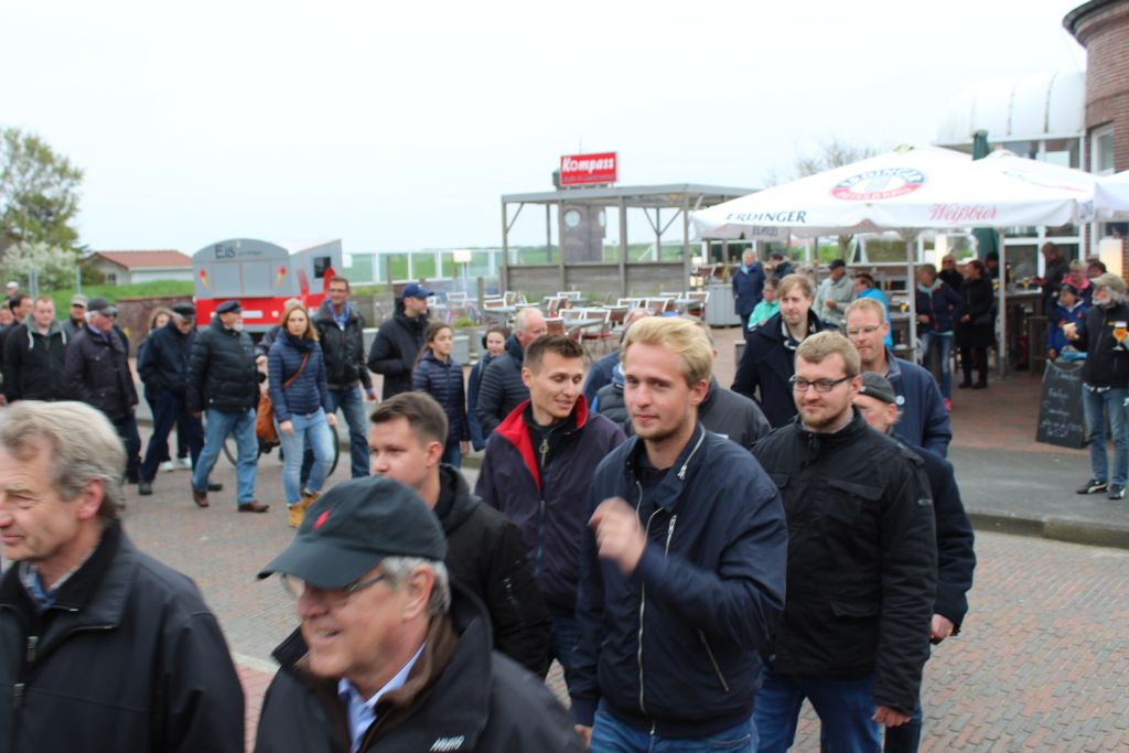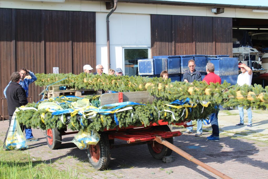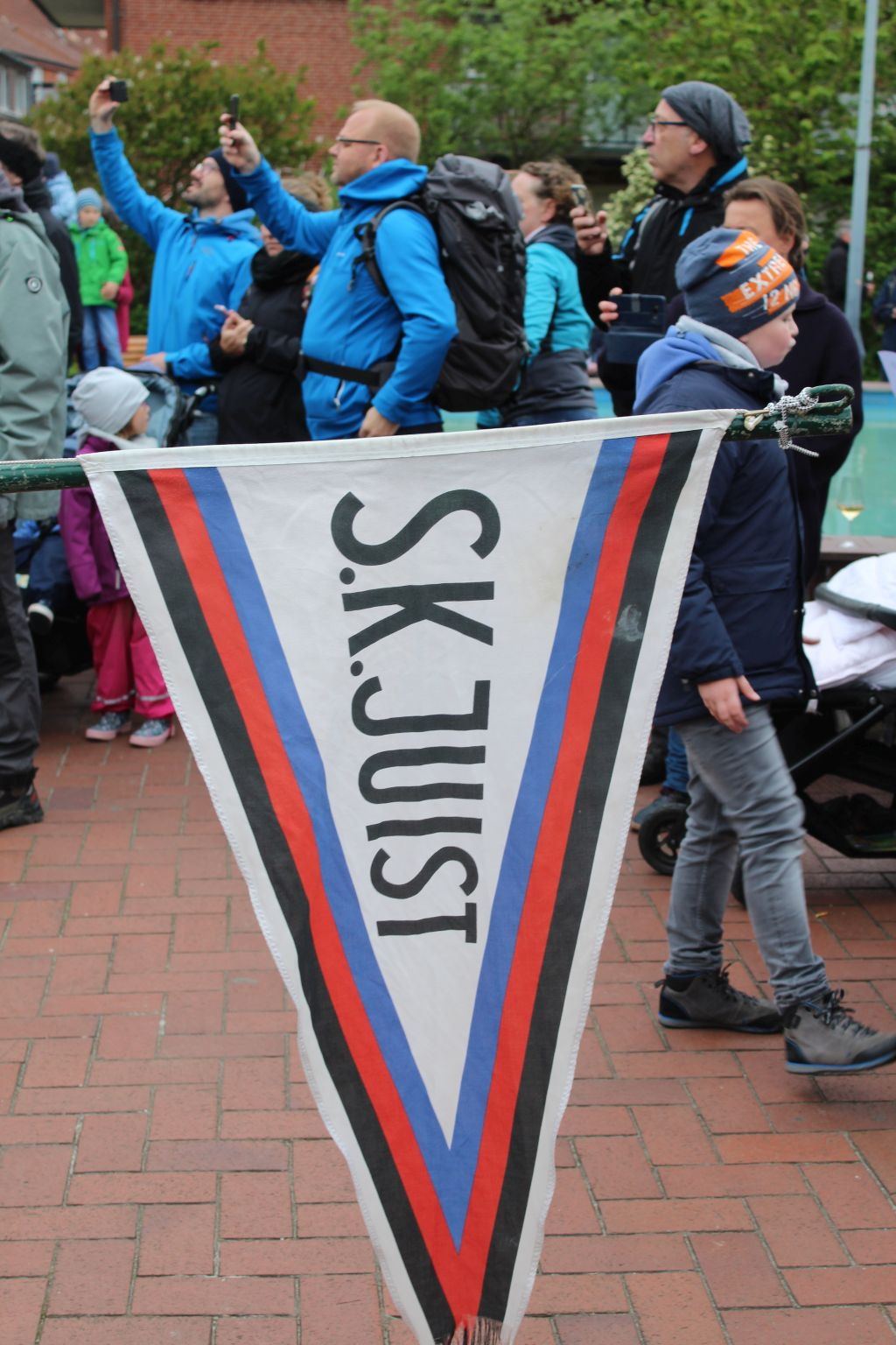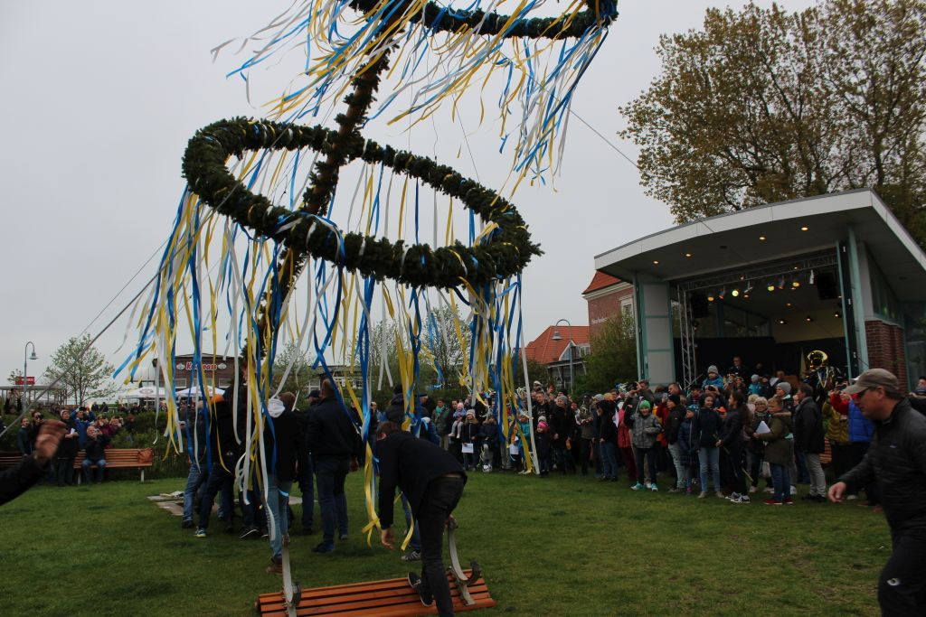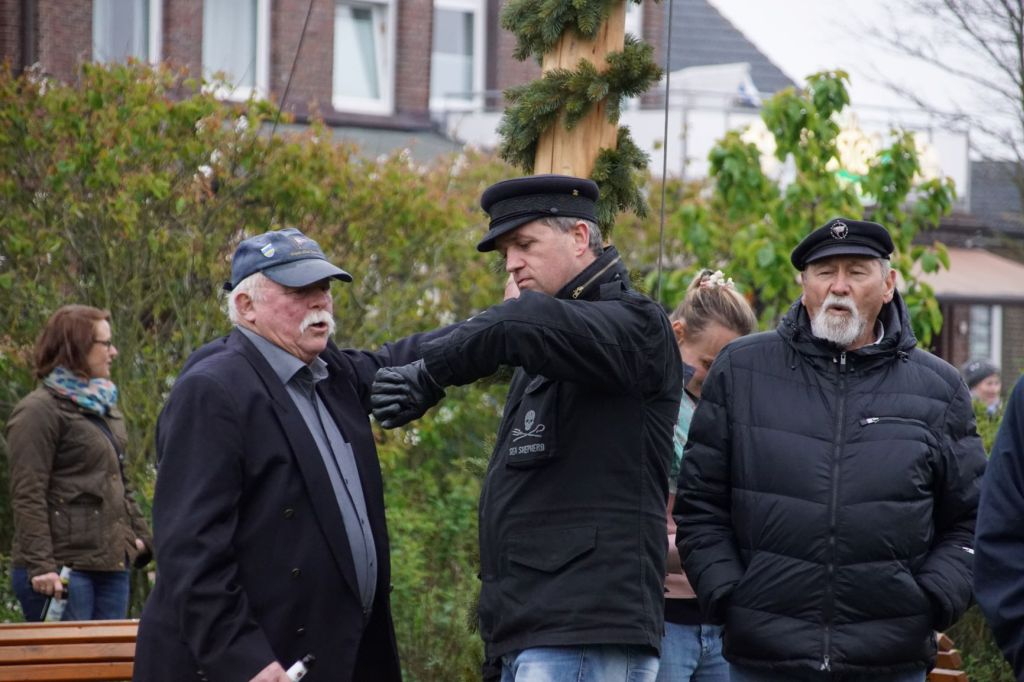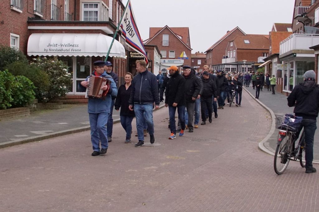 Zu den Aufgaben gehört die Vorbereitung und das Schmücken des Baumes, das Aufstellen, die Bewachung in der Nacht vom 30. April bis zum 1. Mai und das Abbauen am Monatsende. SKJ-Vorsitzender Olaf Weers freute sich, dass die Beteiligung der Mitglieder überall sehr stark und mehr als ausreichend war. Schon zum Schmücken am Bootshaus kamen bei strahlendem Sommerwetter sehr viele Wassersportler, Ehefrauen, Jugendliche und Kinder. Der Aufstellung voran ging ein Umzug durch das Dort, hier nahmen alleine 62 SKJ-Mitglieder teil, ebenso zahlreiche Insulaner, der Kindergarten „Schwalbennest“, die Volkstanz- und Trachtengruppe „Juister Hupfdohlen“ vom Heimatverein, vorneweg Thomas Fisser vom Shanty-Chor (aber auch SKJ-Mitglied) mit seinem Akkordeon. Es waren aber noch mehr Mitglieder aktiv, diese waren schon auf dem Kurplatz am Grill- oder Bierstand sowie als Musiker in der Konzertmuschel. Dort war nämlich der Musikzug der Freiwilligen Feuerwehr Juist unter der Leitung von Stabführer Michael Bockelmann (ebenfalls SKJ-Mitglied) mit bekannten Mailiedern dabei. Beim Aufstellen des Baumes gab es einige Helfer vom Heimatverein, die in jedem Jahr dabei sind und genau wissen, wie man den Baum aufstellt und gegen Umfallen sichert.
