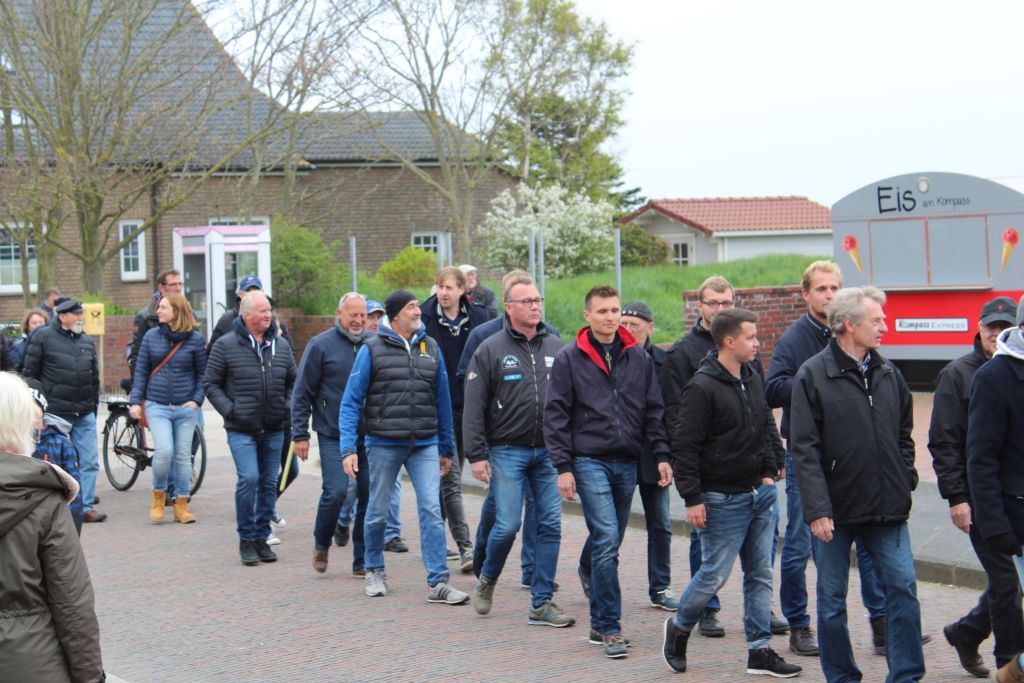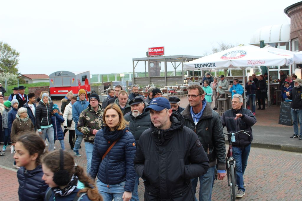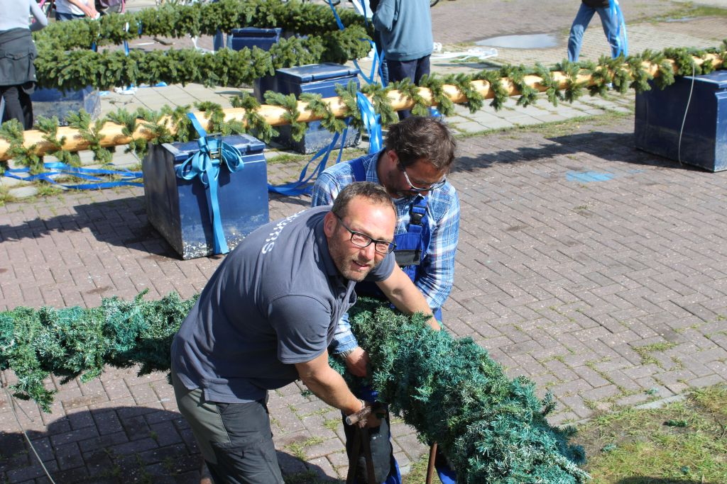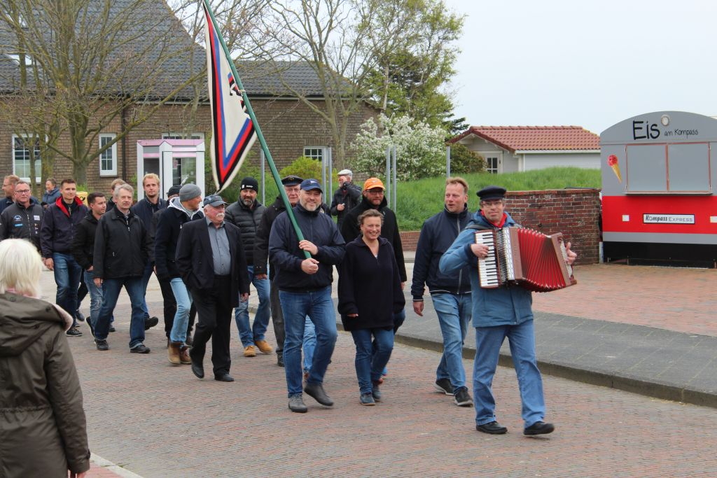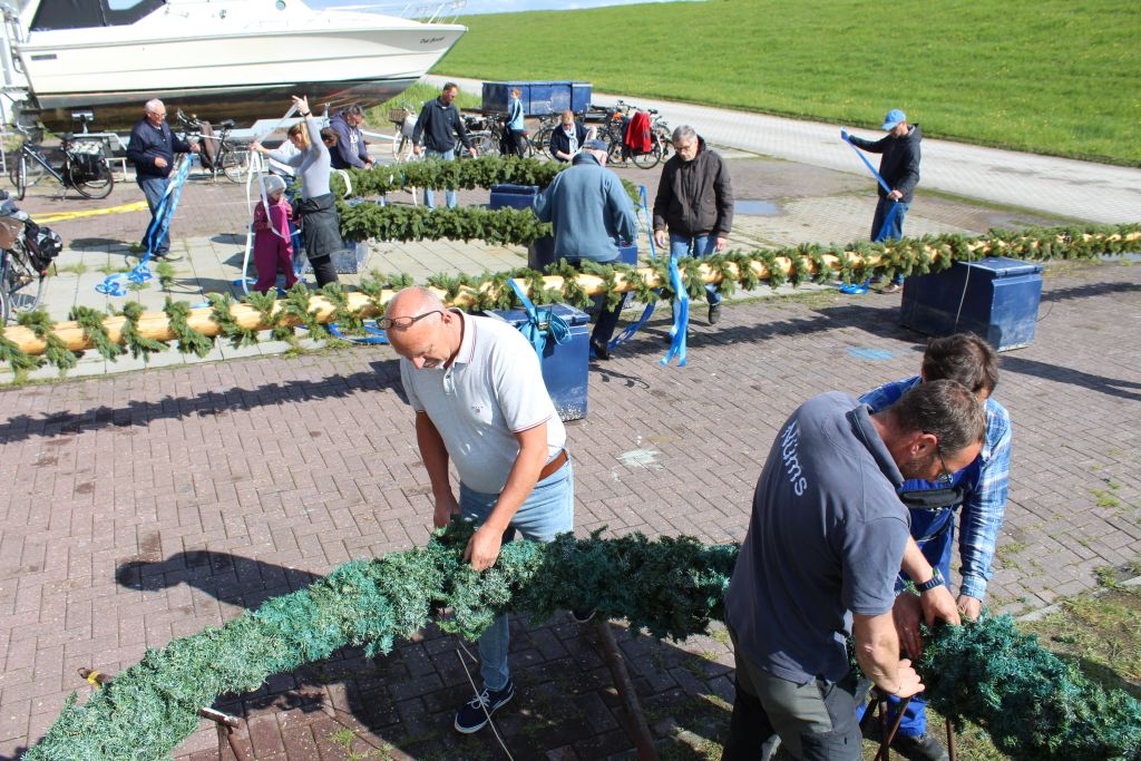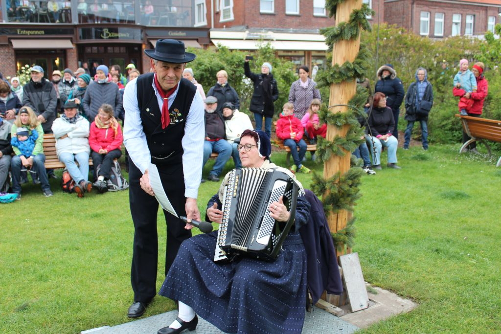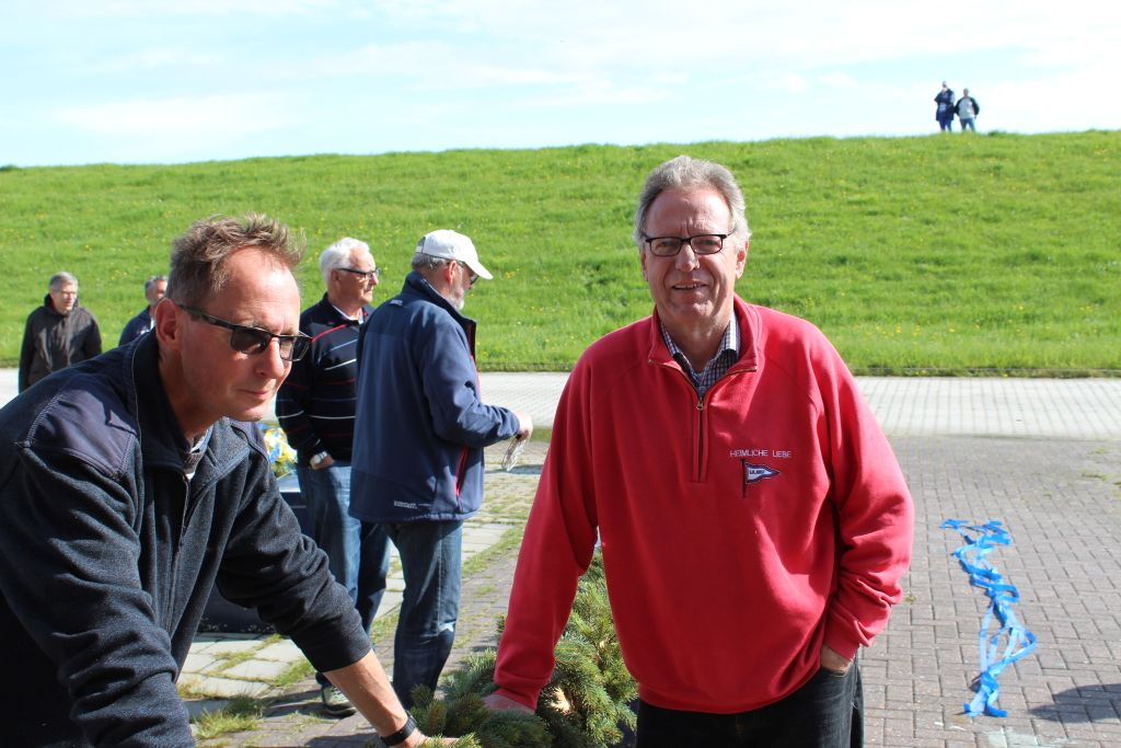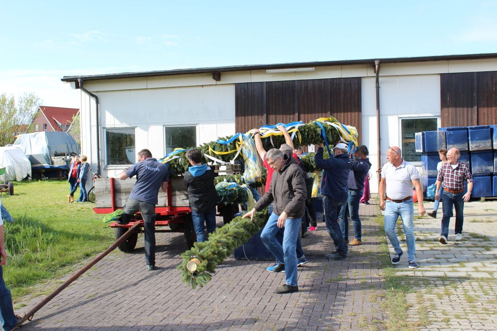 Zu den Aufgaben gehört die Vorbereitung und das Schmücken des Baumes, das Aufstellen, die Bewachung in der Nacht vom 30. April bis zum 1. Mai und das Abbauen am Monatsende. SKJ-Vorsitzender Olaf Weers freute sich, dass die Beteiligung der Mitglieder überall sehr stark und mehr als ausreichend war. Schon zum Schmücken am Bootshaus kamen bei strahlendem Sommerwetter sehr viele Wassersportler, Ehefrauen, Jugendliche und Kinder. Der Aufstellung voran ging ein Umzug durch das Dort, hier nahmen alleine 62 SKJ-Mitglieder teil, ebenso zahlreiche Insulaner, der Kindergarten „Schwalbennest“, die Volkstanz- und Trachtengruppe „Juister Hupfdohlen“ vom Heimatverein, vorneweg Thomas Fisser vom Shanty-Chor (aber auch SKJ-Mitglied) mit seinem Akkordeon. Es waren aber noch mehr Mitglieder aktiv, diese waren schon auf dem Kurplatz am Grill- oder Bierstand sowie als Musiker in der Konzertmuschel. Dort war nämlich der Musikzug der Freiwilligen Feuerwehr Juist unter der Leitung von Stabführer Michael Bockelmann (ebenfalls SKJ-Mitglied) mit bekannten Mailiedern dabei. Beim Aufstellen des Baumes gab es einige Helfer vom Heimatverein, die in jedem Jahr dabei sind und genau wissen, wie man den Baum aufstellt und gegen Umfallen sichert.
