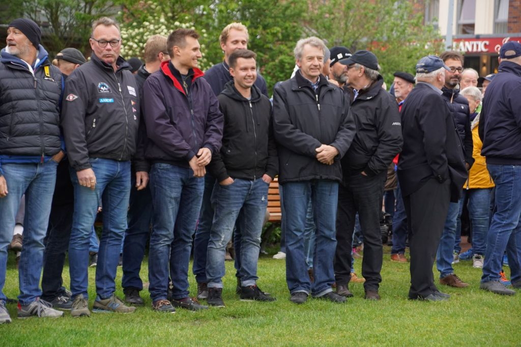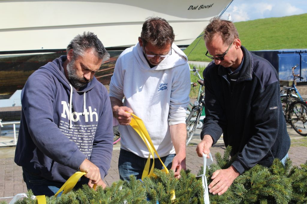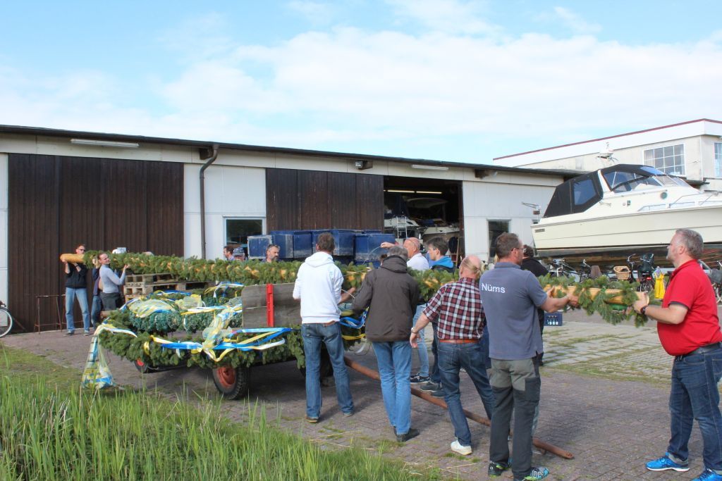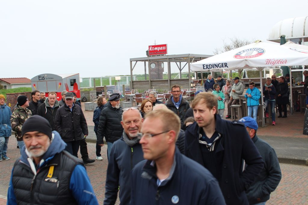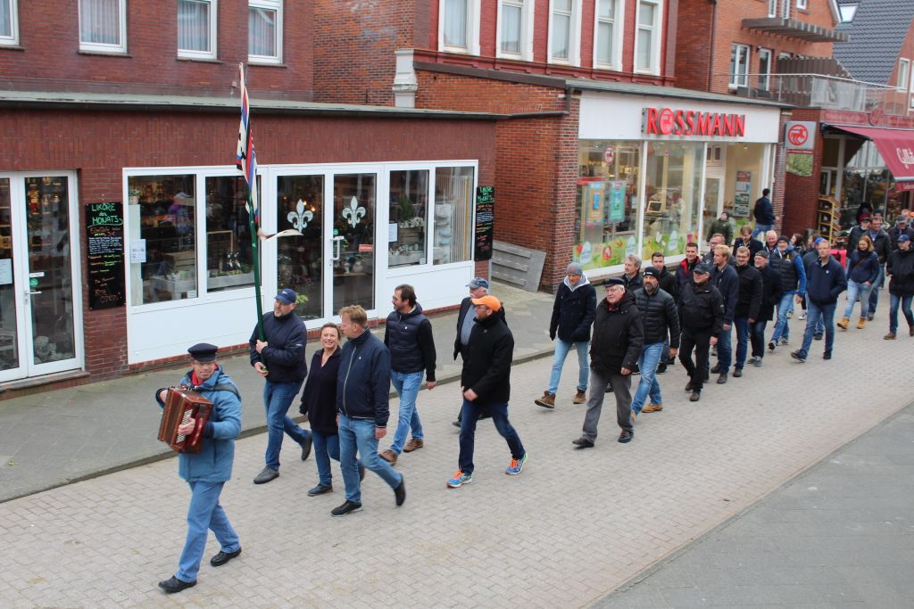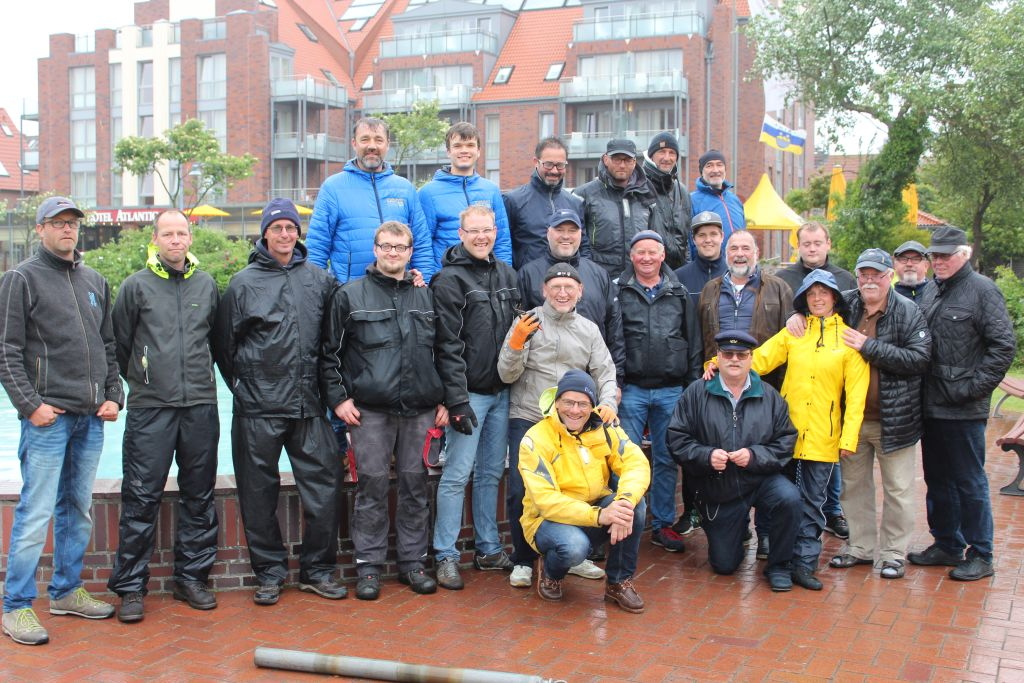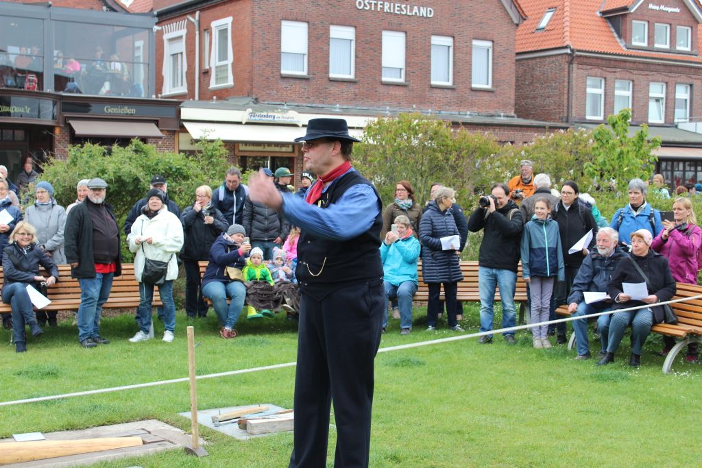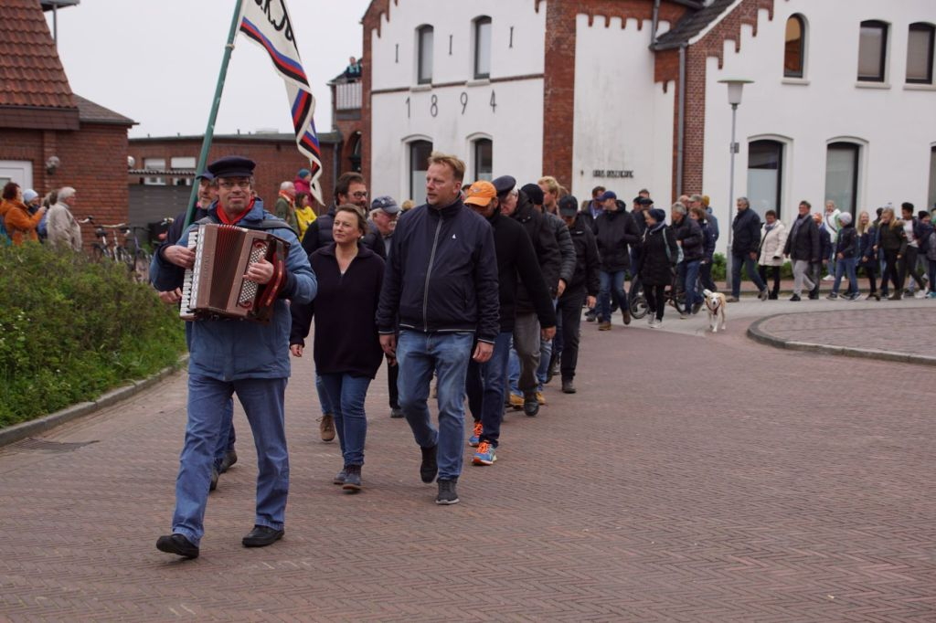 Zu den Aufgaben gehört die Vorbereitung und das Schmücken des Baumes, das Aufstellen, die Bewachung in der Nacht vom 30. April bis zum 1. Mai und das Abbauen am Monatsende. SKJ-Vorsitzender Olaf Weers freute sich, dass die Beteiligung der Mitglieder überall sehr stark und mehr als ausreichend war. Schon zum Schmücken am Bootshaus kamen bei strahlendem Sommerwetter sehr viele Wassersportler, Ehefrauen, Jugendliche und Kinder. Der Aufstellung voran ging ein Umzug durch das Dort, hier nahmen alleine 62 SKJ-Mitglieder teil, ebenso zahlreiche Insulaner, der Kindergarten „Schwalbennest“, die Volkstanz- und Trachtengruppe „Juister Hupfdohlen“ vom Heimatverein, vorneweg Thomas Fisser vom Shanty-Chor (aber auch SKJ-Mitglied) mit seinem Akkordeon. Es waren aber noch mehr Mitglieder aktiv, diese waren schon auf dem Kurplatz am Grill- oder Bierstand sowie als Musiker in der Konzertmuschel. Dort war nämlich der Musikzug der Freiwilligen Feuerwehr Juist unter der Leitung von Stabführer Michael Bockelmann (ebenfalls SKJ-Mitglied) mit bekannten Mailiedern dabei. Beim Aufstellen des Baumes gab es einige Helfer vom Heimatverein, die in jedem Jahr dabei sind und genau wissen, wie man den Baum aufstellt und gegen Umfallen sichert.