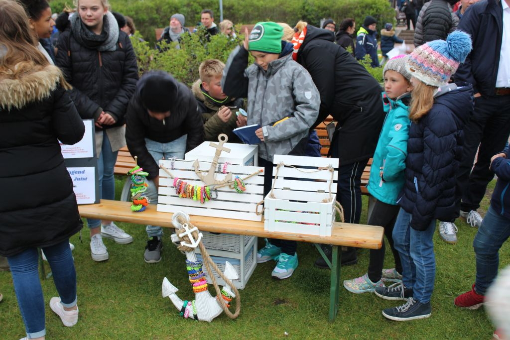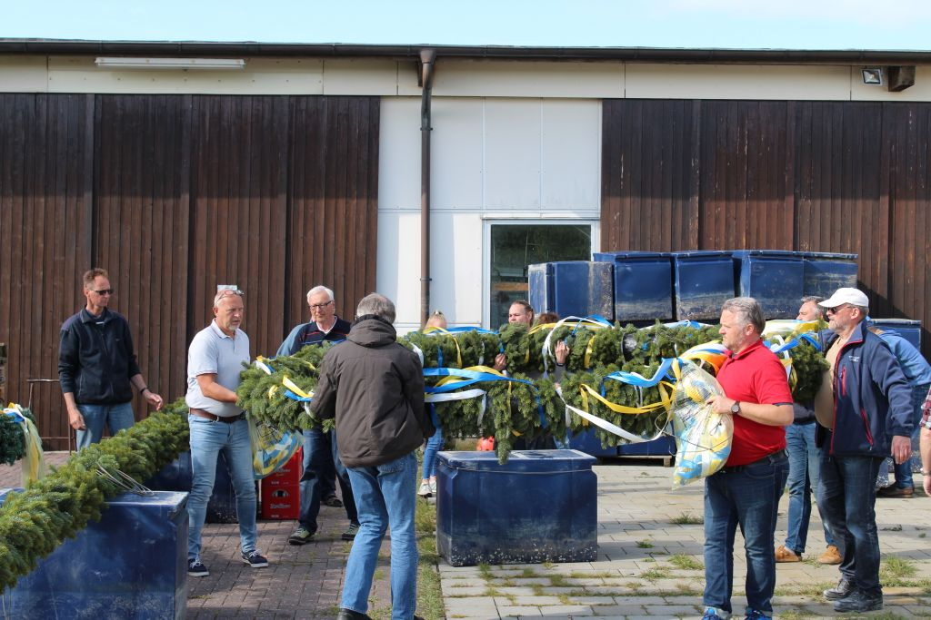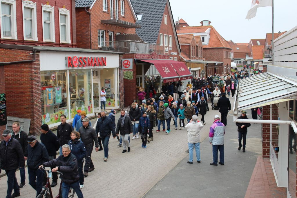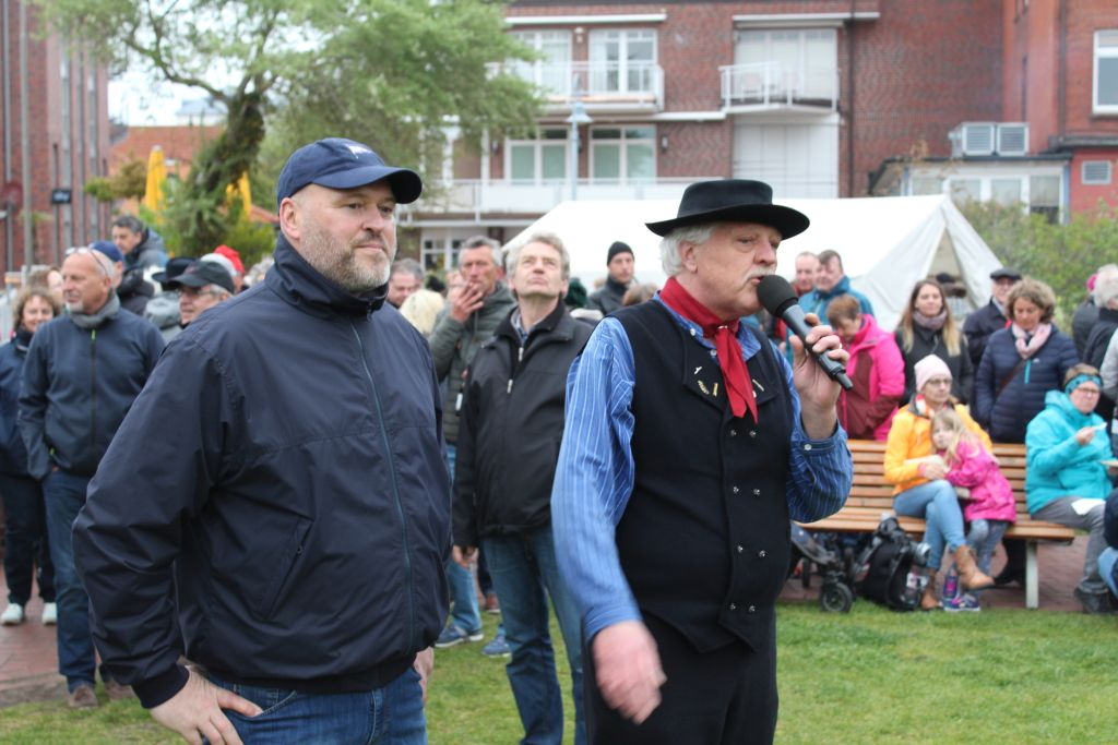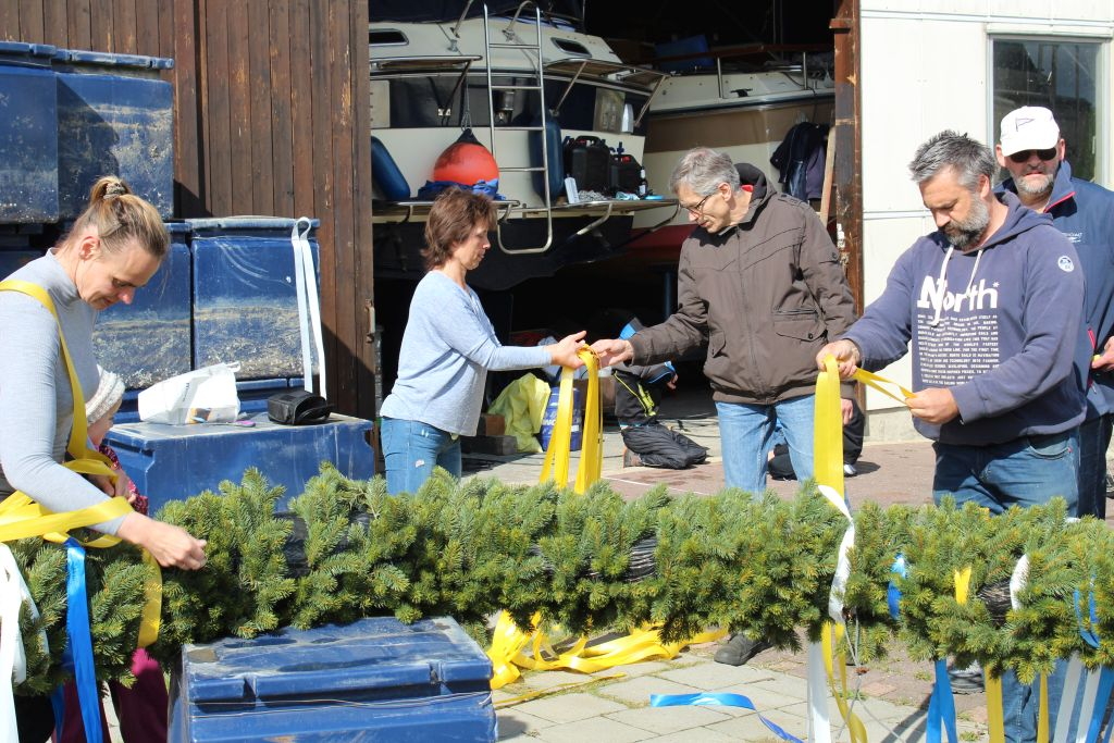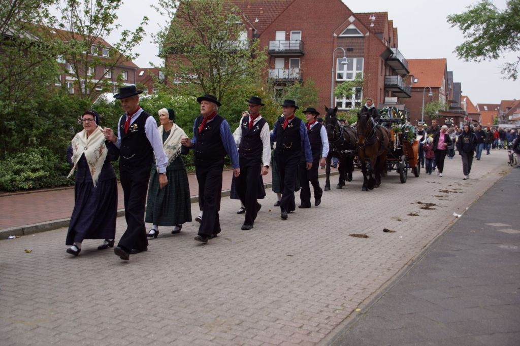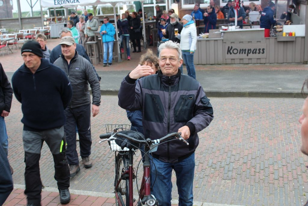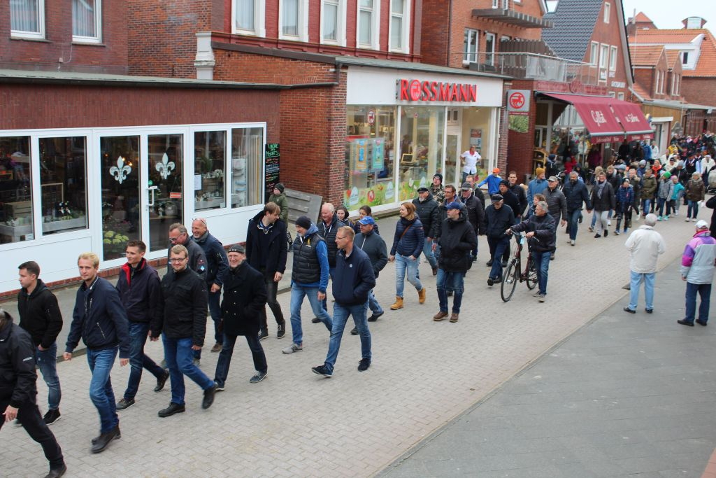 Zu den Aufgaben gehört die Vorbereitung und das Schmücken des Baumes, das Aufstellen, die Bewachung in der Nacht vom 30. April bis zum 1. Mai und das Abbauen am Monatsende. SKJ-Vorsitzender Olaf Weers freute sich, dass die Beteiligung der Mitglieder überall sehr stark und mehr als ausreichend war. Schon zum Schmücken am Bootshaus kamen bei strahlendem Sommerwetter sehr viele Wassersportler, Ehefrauen, Jugendliche und Kinder. Der Aufstellung voran ging ein Umzug durch das Dort, hier nahmen alleine 62 SKJ-Mitglieder teil, ebenso zahlreiche Insulaner, der Kindergarten „Schwalbennest“, die Volkstanz- und Trachtengruppe „Juister Hupfdohlen“ vom Heimatverein, vorneweg Thomas Fisser vom Shanty-Chor (aber auch SKJ-Mitglied) mit seinem Akkordeon. Es waren aber noch mehr Mitglieder aktiv, diese waren schon auf dem Kurplatz am Grill- oder Bierstand sowie als Musiker in der Konzertmuschel. Dort war nämlich der Musikzug der Freiwilligen Feuerwehr Juist unter der Leitung von Stabführer Michael Bockelmann (ebenfalls SKJ-Mitglied) mit bekannten Mailiedern dabei. Beim Aufstellen des Baumes gab es einige Helfer vom Heimatverein, die in jedem Jahr dabei sind und genau wissen, wie man den Baum aufstellt und gegen Umfallen sichert.